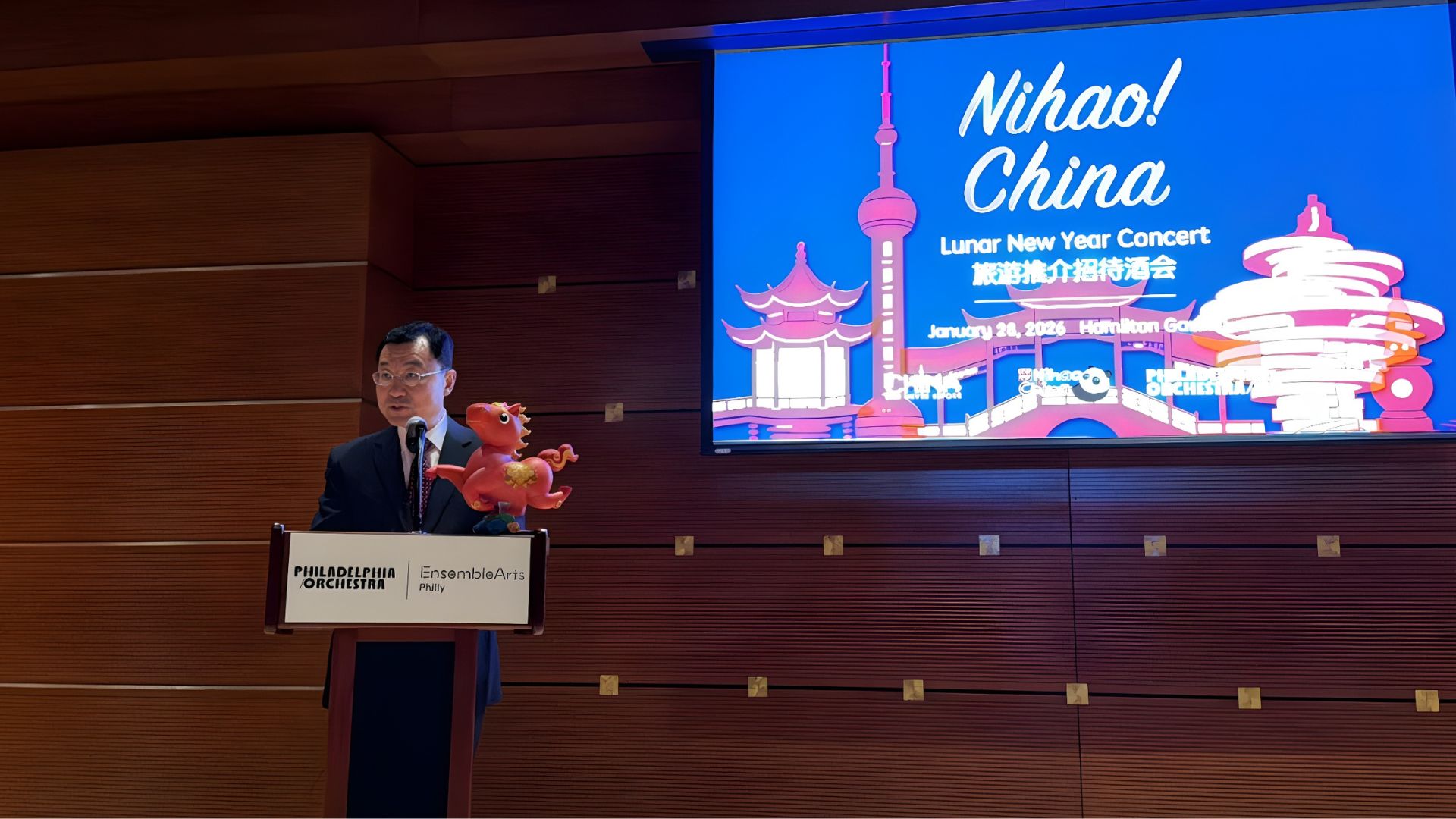 Chinese Ambassador to the United States Xie Feng delivered remarks at the event. Other distinguished attendees included Consul General of China in New York Chen Li; Pennsylvania State Senators Sharif Street and Nikil Saval; Pennsylvania State Representative Keith Harris; Executive Director of the Governor’s Advisory Commission on Asian Pacific American Affairs Razin Karu; Senior Deputy Director of the Pennsylvania Department of Community and Economic Development David Briel; Founder of the U.S.–China Business & Travel Association Zhang Wenlong; Director of the China National Tourist Office New York Ma Yunfei; and Ryan Fleur, President and CEO of The Philadelphia Orchestra and Ensemble Arts.